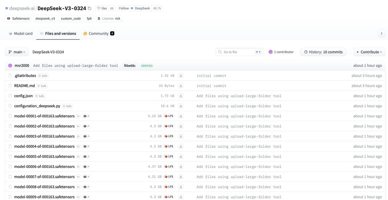 DeepSeek has released a new version of their large language model, DeepSeek-V3-0324, with an MIT license and 641 GB of files, marking a change from their previous custom licensing approach.