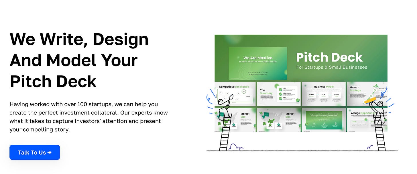 If you’re feeling confused while building a pitch deck, we can help. We’ve created an internal team of experts, designers, and investors to build and review your pitch deck.