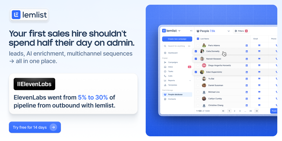 lemlist gives your first sales hire everything they need: 450M+ leads, AI enrichment, and multichannel sequences across email, LinkedIn, and calls - all in one place.