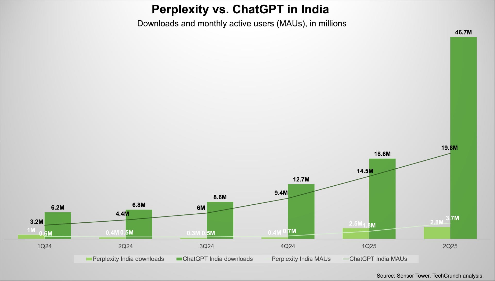 Downloads and MAUs in India surged over 600% year-over-year in Q2, positioning India as Perplexity’s largest market by user base.
