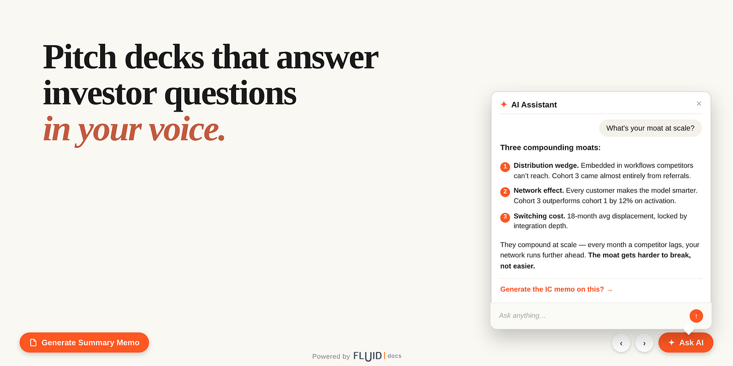 FluidDocs makes pitch decks smarter - they answer investor questions in your voice, generate summary memos on demand, and track every reader action.