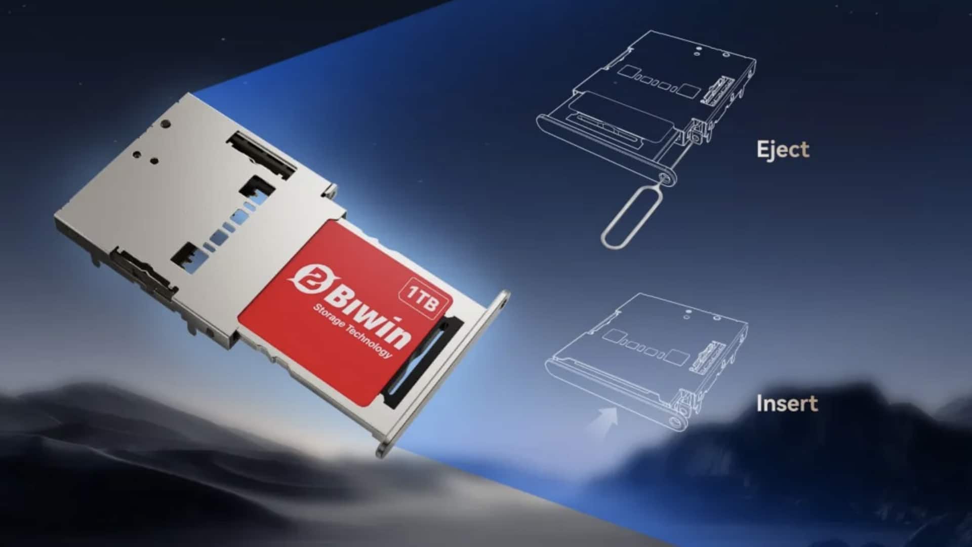 The SSD works like a SIM card tray, with IP68 water/dust resistance and drop protection, and is being positioned for laptops, phones, cameras, and tablets.